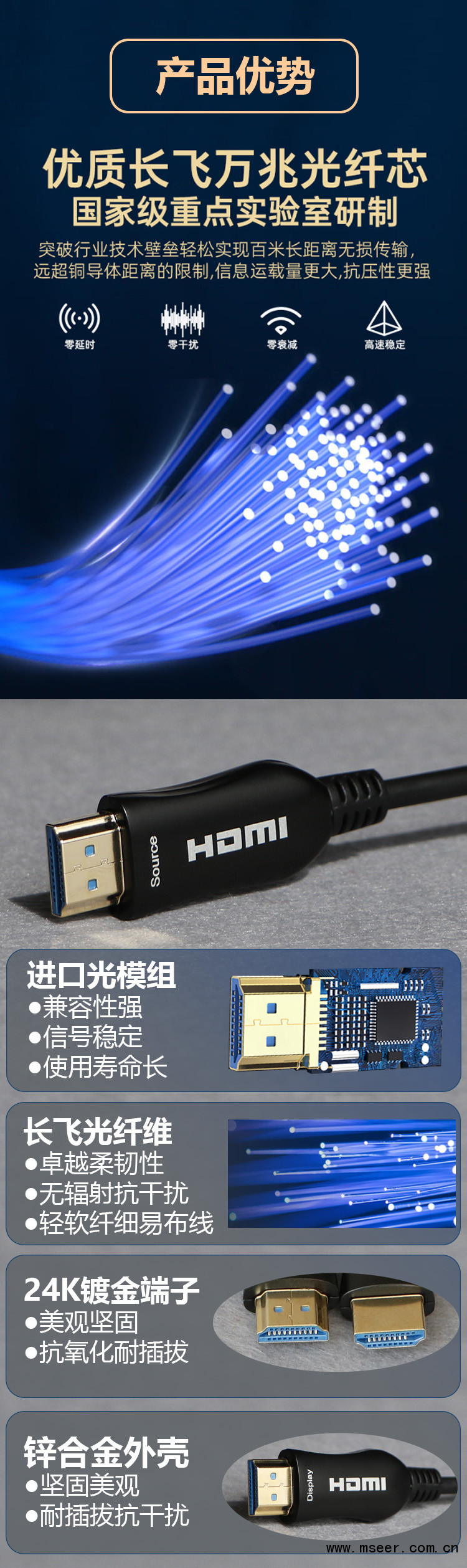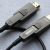 HDMI光纖線具有較好的抗電磁和射頻干擾。相較于傳統銅纜,光纖HDMI線具有傳輸更長、更細、更軟、信號質量更高的特點,產品可在具有挑戰性的環境下穩定、可靠的工作。
