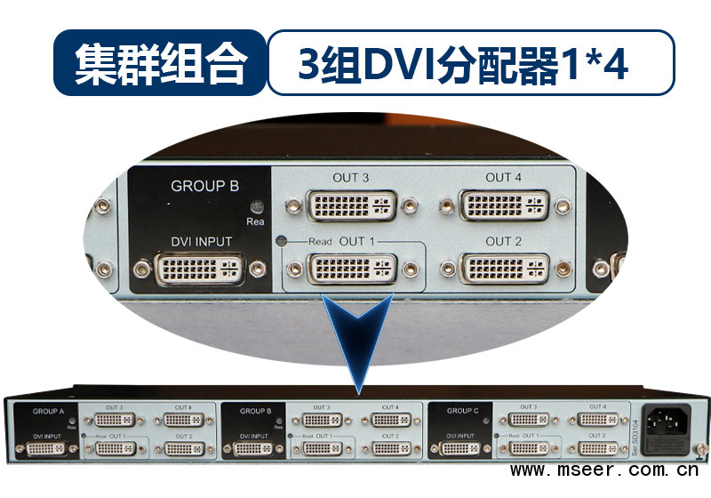 將3組DVI分配器組裝在一臺標準1U機架中??蓪?路單鏈路DVI 信號分別分配到4路數字式顯示器。支持高達1920x1200P60的DVI-D信號。