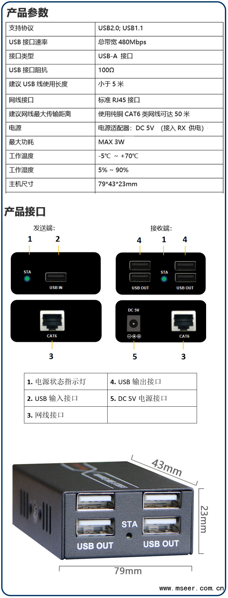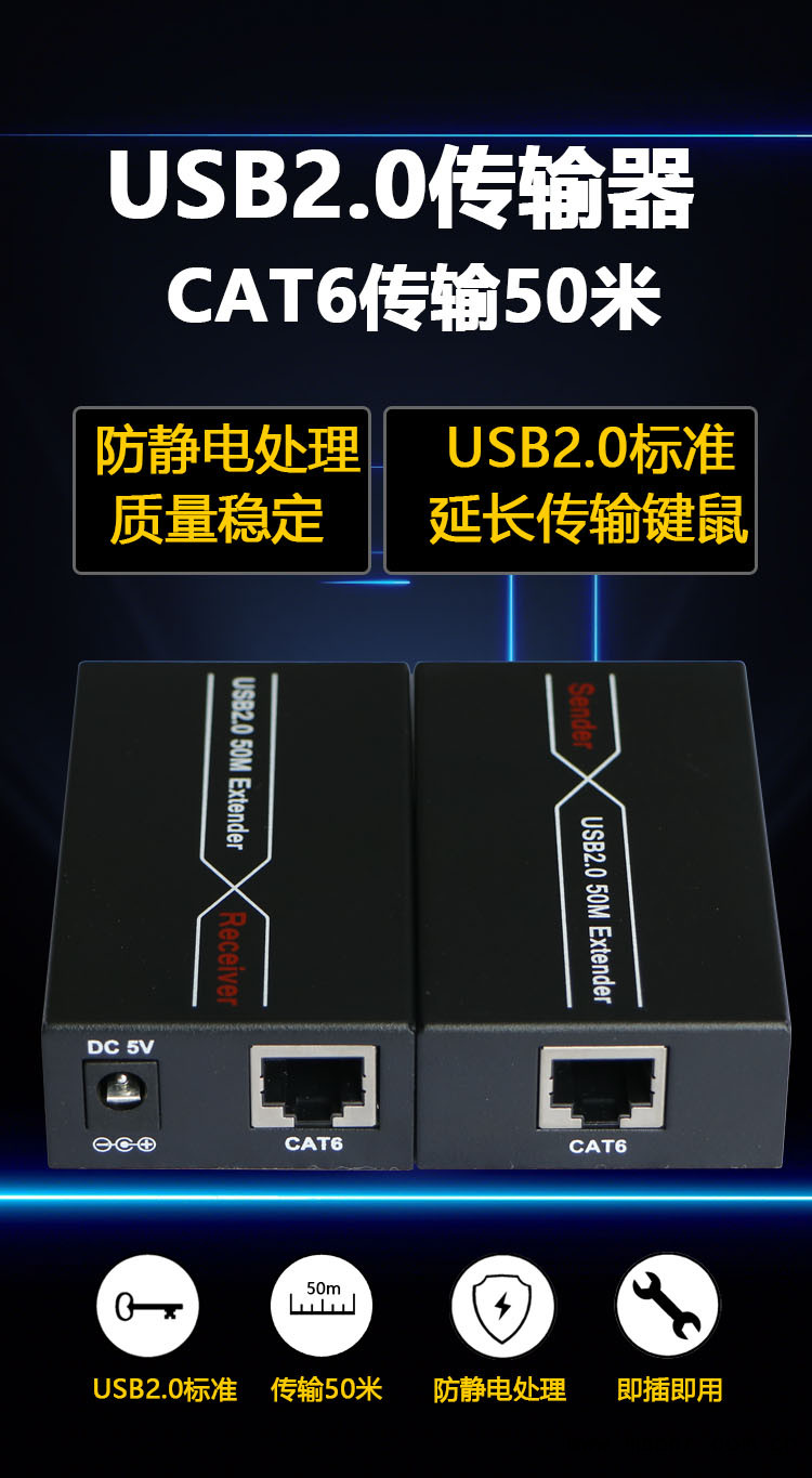 ☆支持通過單根CAT5/5e/6網線,將USB信號延長50米